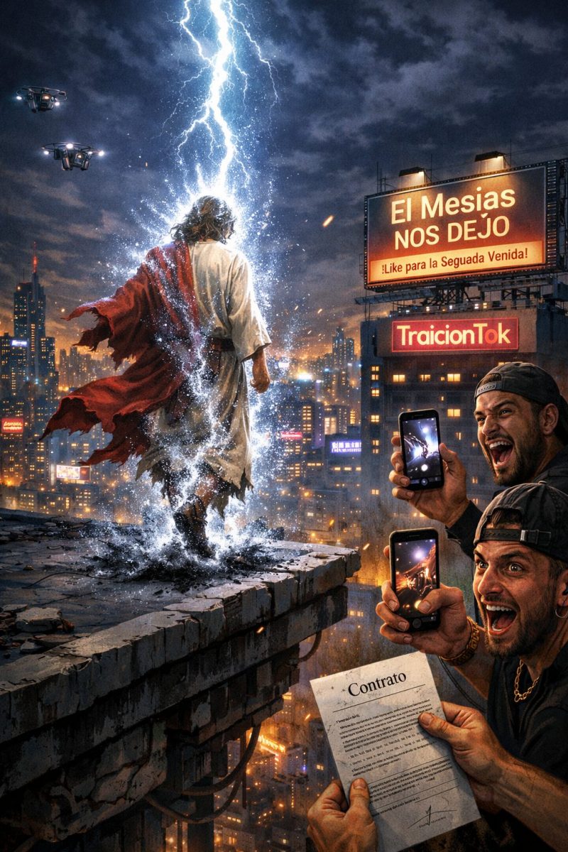 Una noche, agotado por las demandas de sus nuevos discípulos, se sentó en la azotea de su oficina llena de antenas de comunicación. Mirando las luces de la ciudad parpadear como estrellas artificiales, suspiró: « Padre, dime, ¿acaso llegué tarde? Tu rebaño no busca redención, busca audiencia. No quiere aprender a amar, solo quiere likes. No quiere salvarse, solo ser tendencia. Tal vez no soy el Mesías que necesitan. Tal vez el mundo ya no necesita uno.»